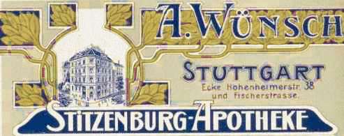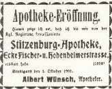 Ew. Hochwohlgeboren mir von der Kgl. Regierung concessionierte neue Apotheke Hohenheimerstrasse 38 Ecke Fischer- und Hohenheimerstrasse im Laufe des Sommers eingerichtet und nun unter dem Namen "Stitzenburg – Apotheke" eröffnet habe. Die Einrichtung entspricht dem neuesten Stande der Zu einer Besichtigung der Offizin lade ich ganz Hochachtungsvoll Apotheker Stuttgart, im Oktober 1901